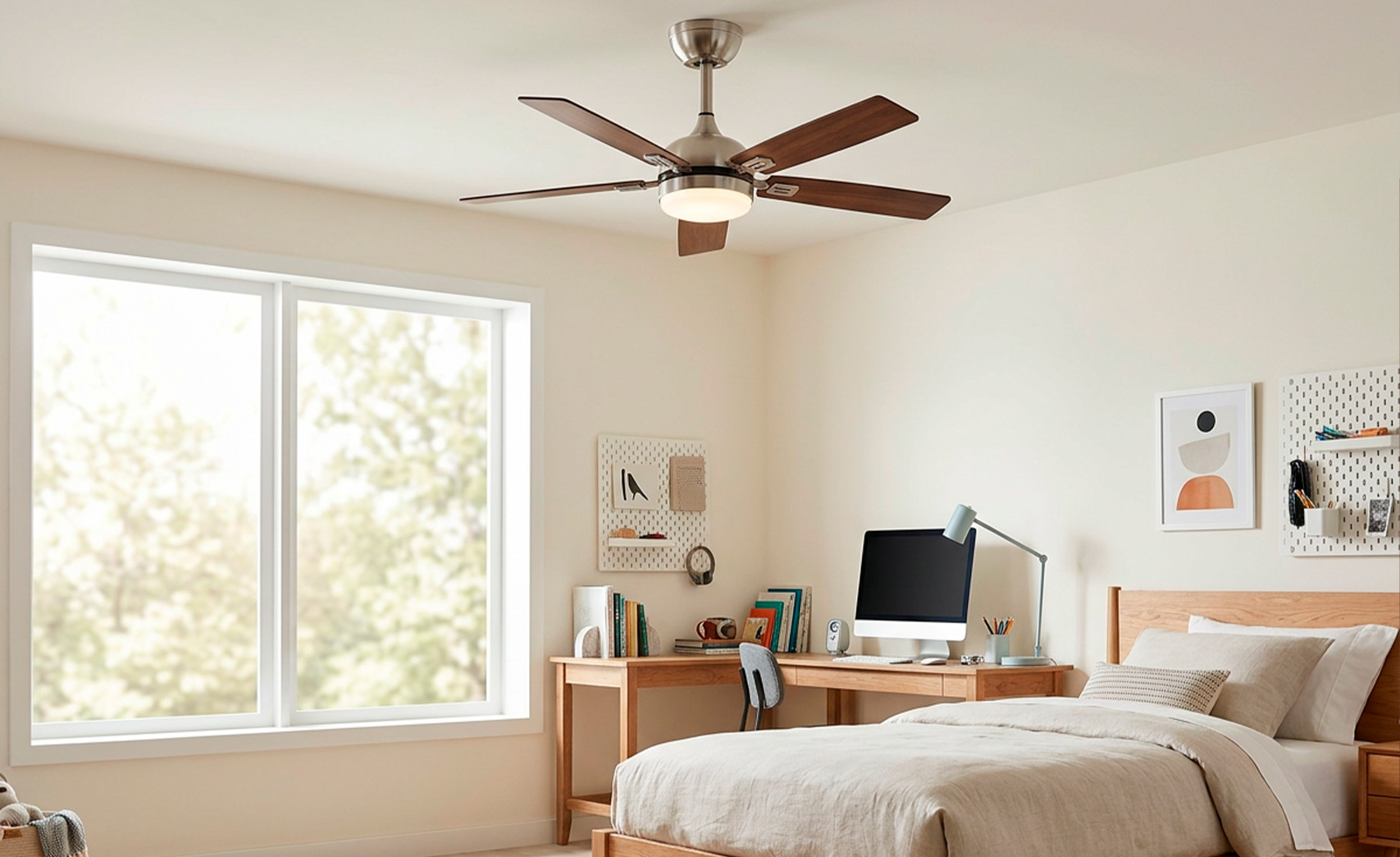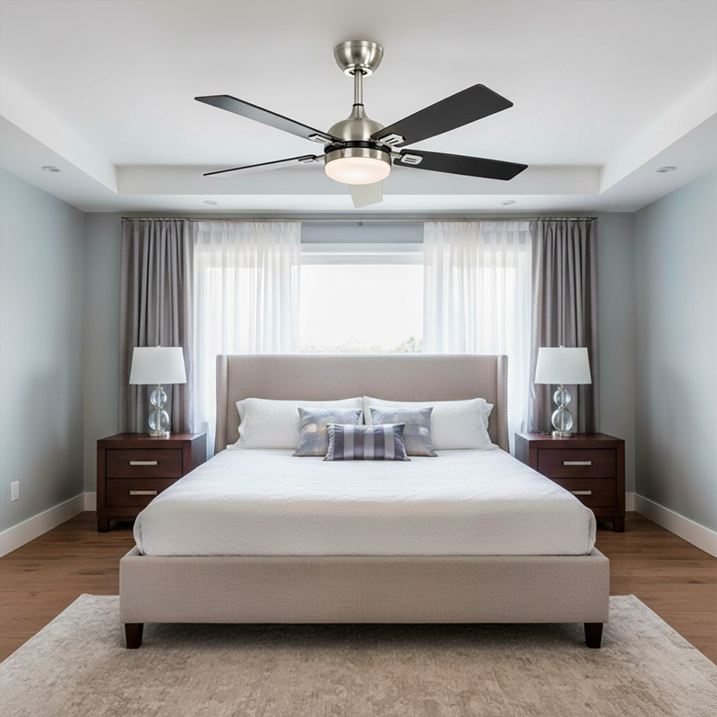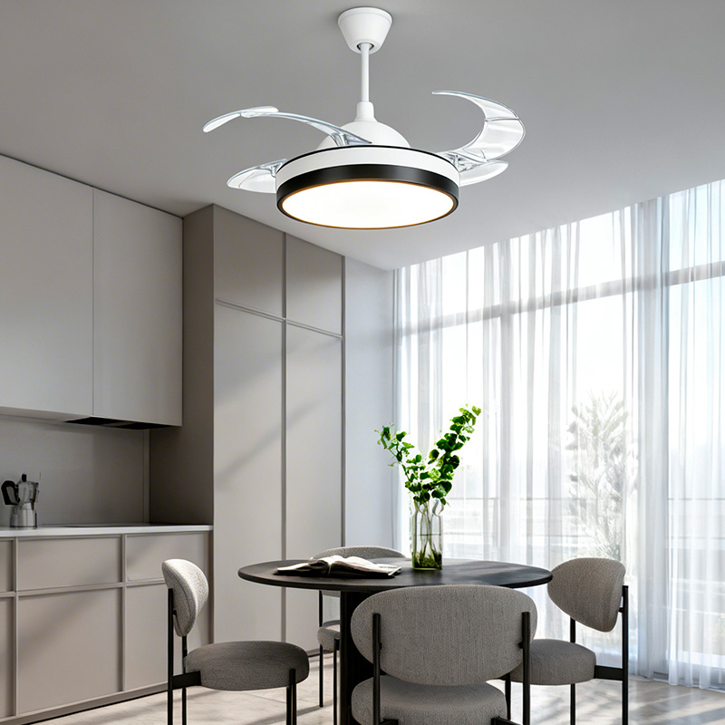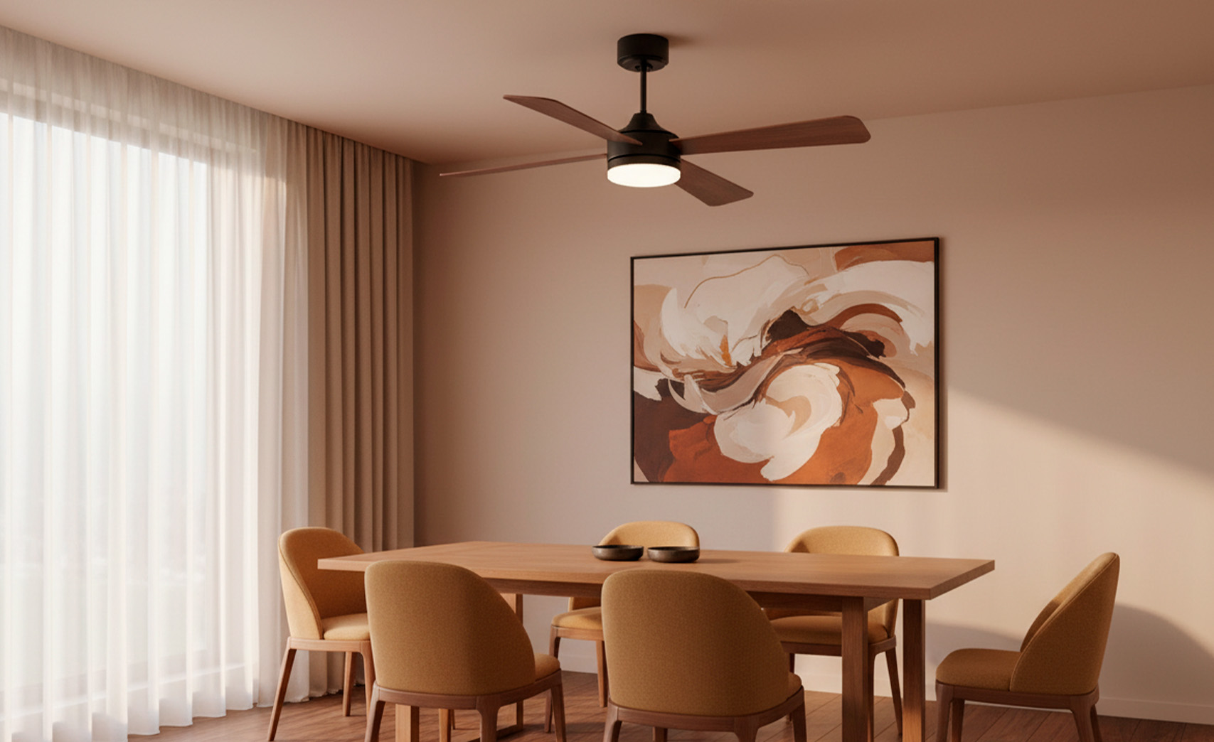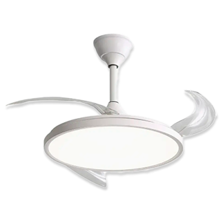 Diseño de 4 aspas con iluminación LED ajustable, control remoto y conectividad inteligente desde la app FANLAMP.